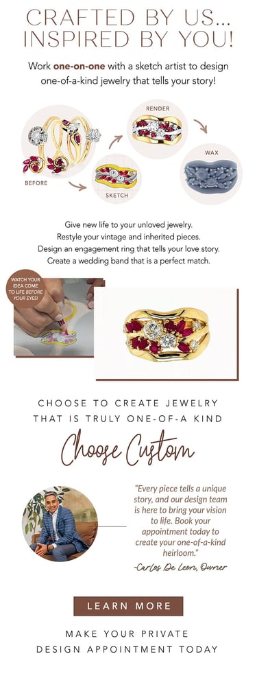 Founded by Carlos De Leon, Bespoke Jewelry is about making magic happen, together. We're here to bring your personal jewelry ideas to life and to help our partners create sparkling, seamless custom events. From marketing to the main event, we're by your side. We're not happy until our partners and our customers are thrilled.